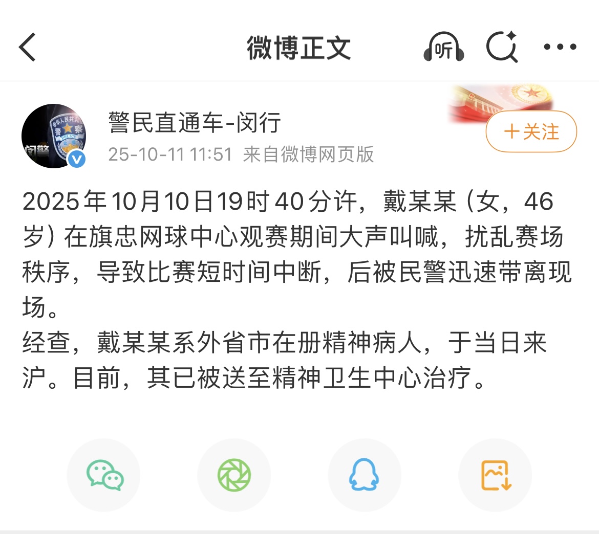 据@警民直通车-闵行 消息,2025年10月10日19时40分许,戴某某(女升富配资,46岁)在旗忠网球中心观赛期间大声叫喊,扰乱赛场秩序,导致比赛短时间中断,后被民警迅速带离现场。
